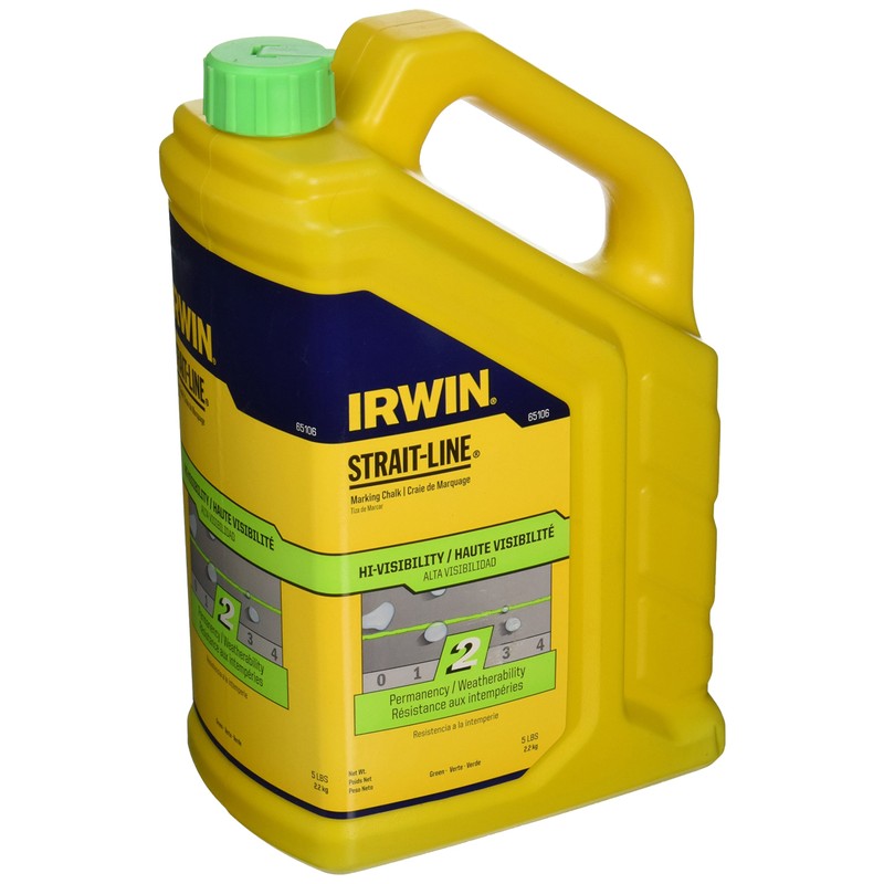 Marking chalk marks are temporary. Provides greater visibility in standard lighting conditions. Durable formula is weather-resistant and suitable for interior or exterior use. Use to show layout changes and corrections on metal, concrete, lumber, plastic, cardboard and other surfaces. IRWIN Tools STRAIT- LINE Standard Marking Chalk, 5-pound, Fluorescent Green (65106)