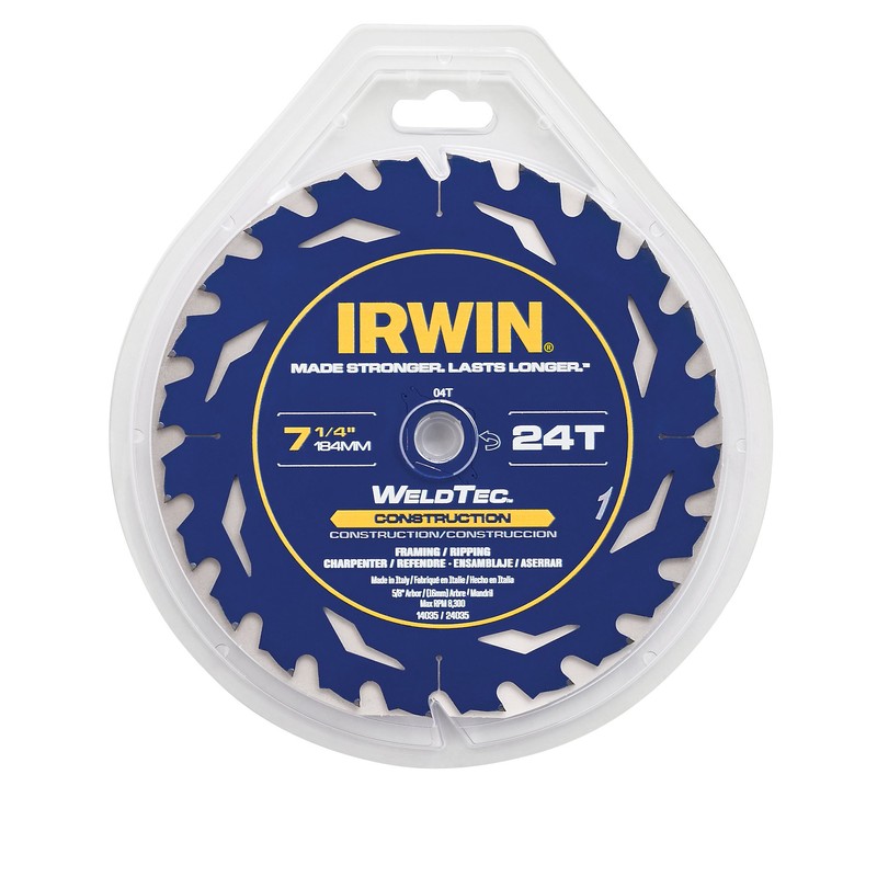 - The IRWIN Weld Tec Circular Saw Blade, Framing and Ripping, is made stronger to last longer. This ultra-thin kerf blade features patented Weld Tec technology with carbide teeth that are welded not brazed and delivers the fastest cutting speed and increased durability when compared to previous IRWIN blades. Constructed with a heat-resistant, non-stick coating to reduce binding and gumming, these blades have laser-cut expansion slots to reduce warping and ring tensioned to maintain balance.