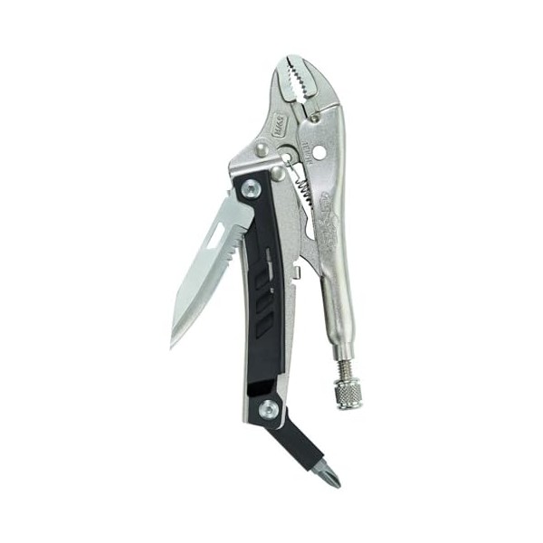 The IRWIN VISE-GRIP Locking Multi-Pliers with Wire Cutter, Curved Jaw, feature the legendary locking pliers performance tradesmen have trusted since 1924. Constructed of high-grade, heat-treated alloy steel, it has an innovative curved jaw design that provides maximum torque with pressure on four points on any style nut or bolt head. Pressure and fit is adjustable with just the turn of a screw while the guarded trigger release can be engaged with only one hand for increased versatility. The 5WR Locking Multi-Pliers include a fold-out stainless steel serrated knife blade, a fold-out screwdriver including a ¼” bit holder with 6-8 slotted and #2 Phillips bits. This 4-tools-in-1 design and added wire cutter allows users to carry fewer tools on the job.