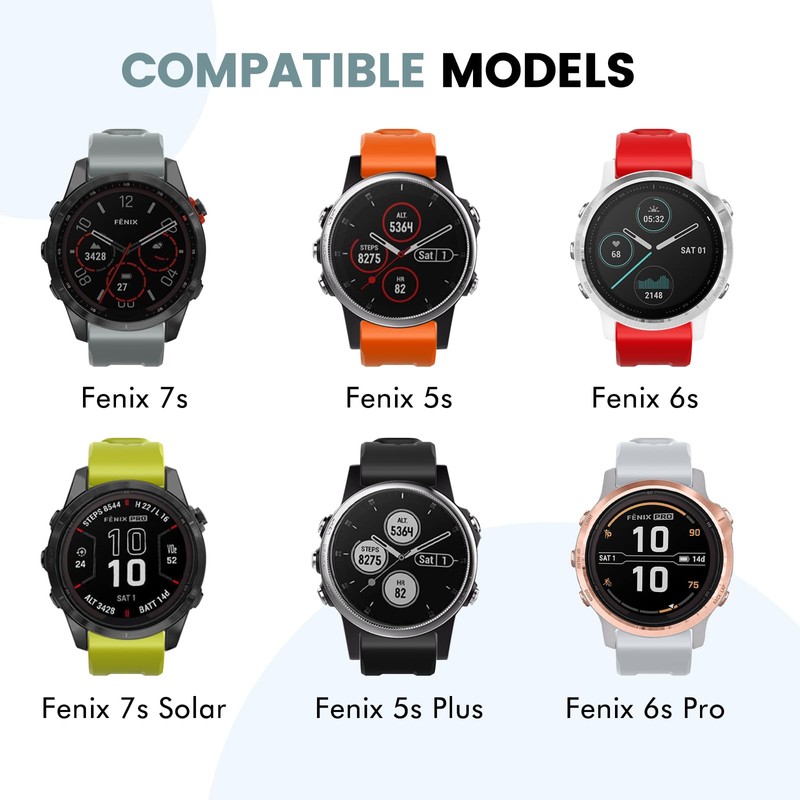 The product is compatible with Garmin Fenix 7s/Fenix 7s Pro/Fenix 7s Solar/Garmin Fenix 7s Sapphire Solar/Fenix 6s/Fenix 6s Pro/Fenix 5s/Fenix 5s Plus/Garmin Epix Pro 42 mm