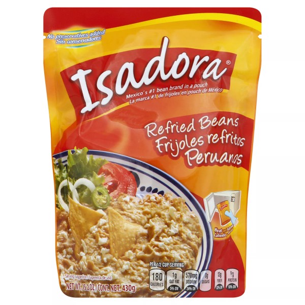 Mexico's No. 1 bean brand in a pouch. No preservatives added. Heat and serve. Per 1/2 Cup Serving: 180 calories; 1 g sat fat (5% DV); 570 mg sodium (24% DV); 0 g sugars; 13 g fiber (52% DV); 8 g protein (16% DV). Easy to open. In Mexico, Isadora revolutionized how to eat beans by introducing the first beans in a pouch. Isadora beans look, feel and taste just like homemade. Our original recipe from Mexico has just delicious bean taste made with some vegetable oil, and a touch of spices. Dispose of properly. Recipes and information at. Product of Mexico.