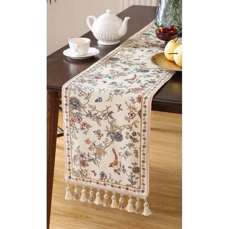 ISAENNE Designer Elegant Linen Table Runner 118 Inches, Flower and Bird Pattern Long Table Runners for Thanksgiving,Dining Room,Banquet,Holiday,Christmas,New Year,12"*118"