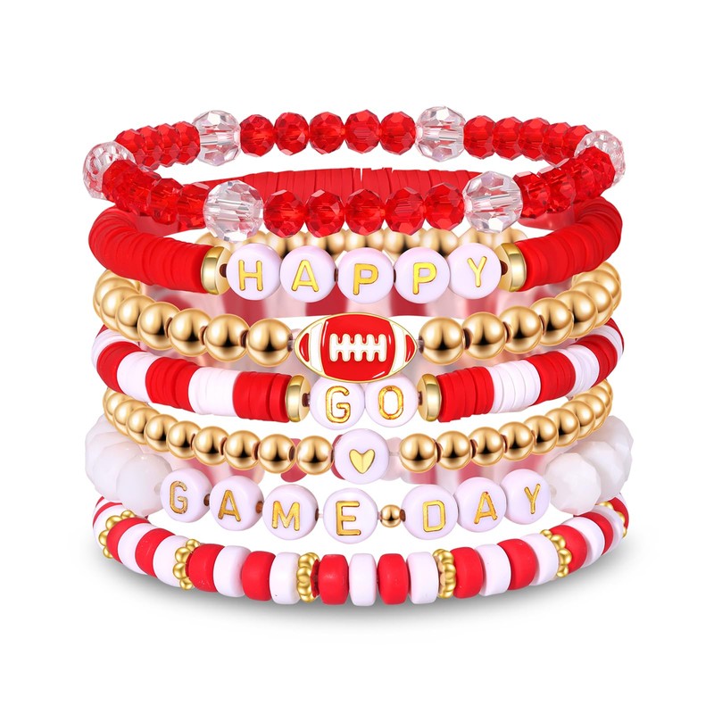 - Game Day Bracelets: It features a set of 7 heishi beaded bracelets, adorned with 6mm red and black polymer clay vinyl disc beads and with White & Gold Letter Beads spelling "HAPPY GO GAME DAY", Wear these red black team color bracelets with your favorite team game day outfits to complete your game day look in style