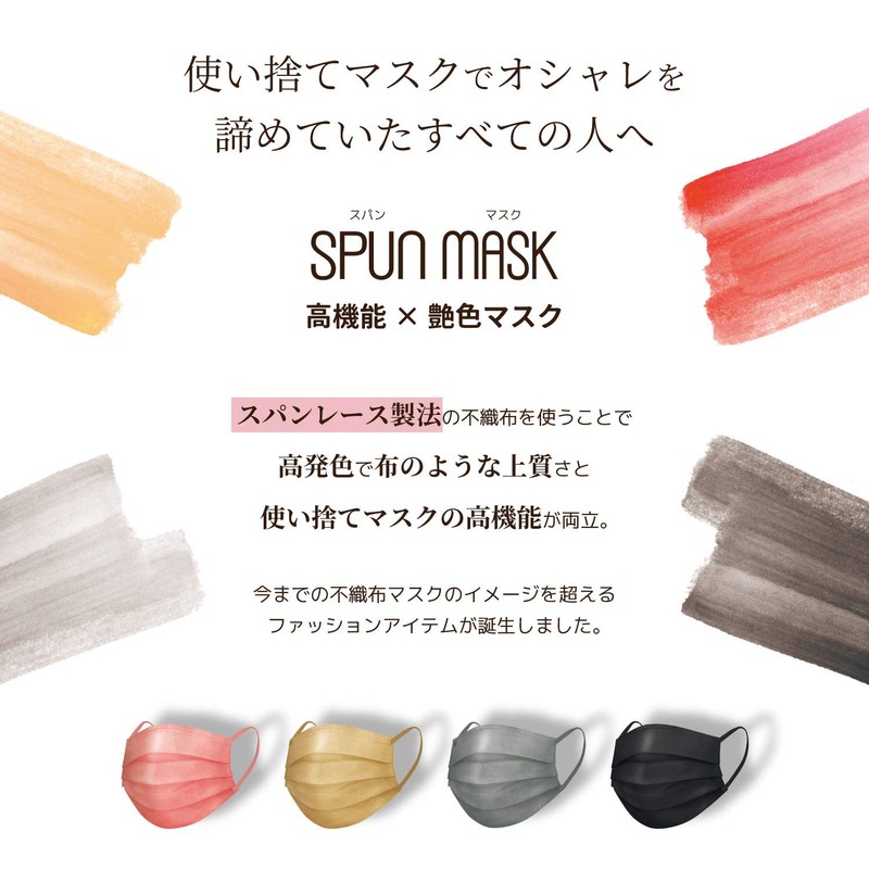 - [Characteristics (Materials)] Spun lace mask is made primarily with water pressure without using binder (bond), and has a luster and feel that ordinary non-woven fabric can. The colors are different at a glance