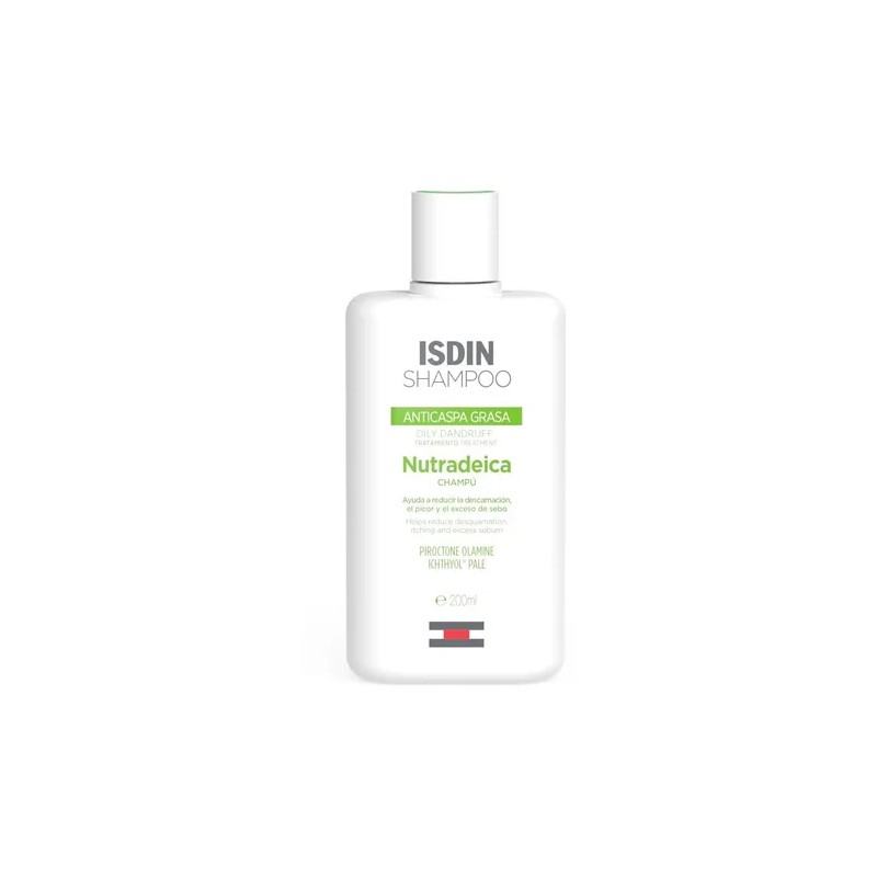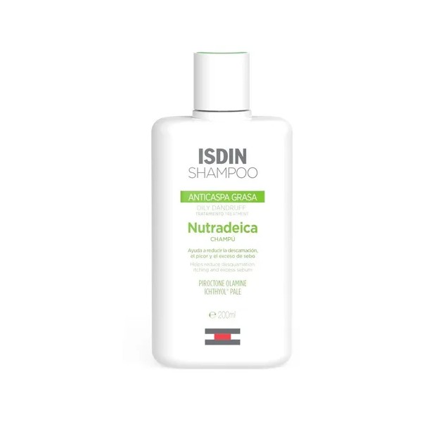 ISDIN Nutradeica Shampoo Anticaspa Grasa 200ml Champú Anticaspa. Reduce la descamación, el picor y el exceso de sebo. Reduce el exceso de sebo, alivia el picor y reduce la caspa dejando el cabello suave, brillante e hidratado. -Su fórmula con Ictiole Pale y Piroctona Olamina reduce el exceso de sebo, alivia el picor y reduce la caspa. -Los resultados son visibles desde las primeras aplicaciones y el efecto se prolonga durante 4 semanas. -Cabello suave, brillante, hidratado, fácil de peinar y libre de grasa. -Probado dermatológicamente. -Aplicar sobre el cabello húmedo. -Masajear hasta hacer espuma. -Dejar actuar durante 3 minutos y enjuagar con abundante agua. -Usar 3 veces por semana. -Ingredientes principales: Piroctona Olamina: efectivo agente anticaspa. Ichtiol Pale: Sodium Shale Oil Sulfonate, agente anticaspa de origen mineral que posee alta seguridad y tolerancia. Silicone Quaternium-22 y PPG-3 Myristyl Ether: acondiciona el cabello y protege las fibras capilares.