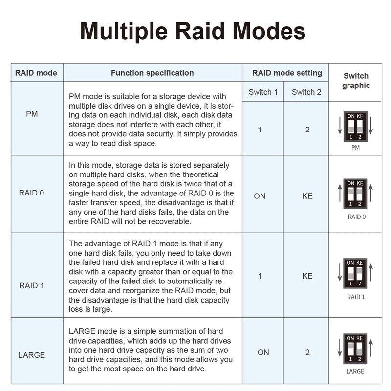 - 【4 RAID Modes】: Offers flexibility with support for RAID 0, RAID 1, LARGE, and Normal 4 modes. Enhance performance with RAID 0 by merging all SSD capacities in the enclosure, or create backups with RAID 1, featuring self-restoration. LARGE mode simplifies management by merging all SSD capacities, while Normal mode enables independent SSD operation without forming any RAID modes.