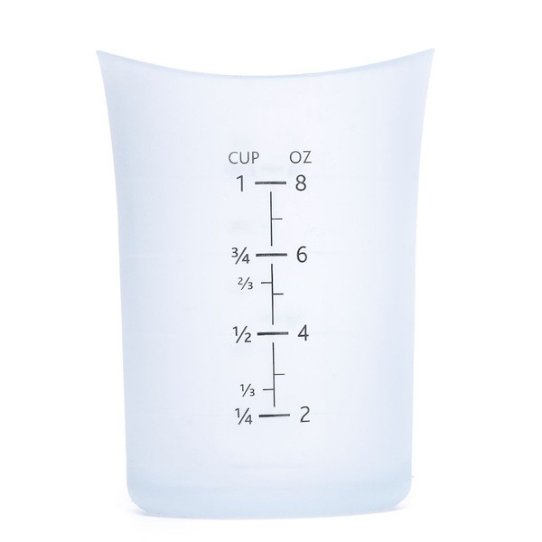 - Silicone measuring cup in translucent silicone with easy to read numbers; microwave and dishwasher safe