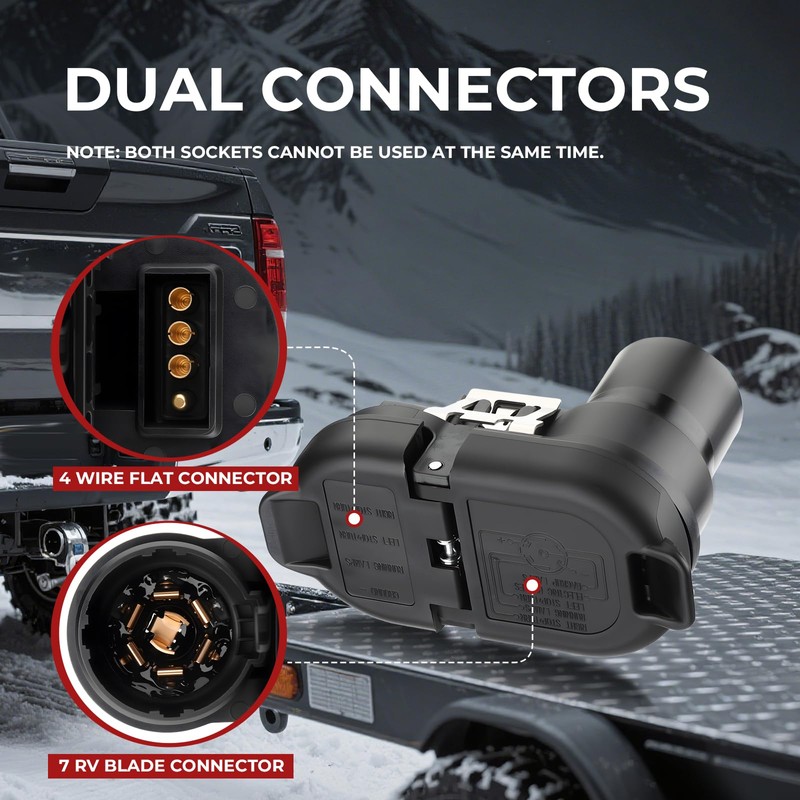 - 【7-Way Function Connector】– Powers taillights, brake lights, turn signals, reverse lights, trailer brakes, and auxiliary power
