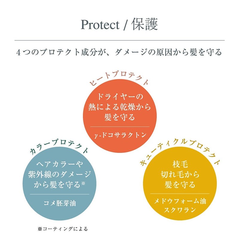 4 types of protective ingredients (🍀-Dokosaracton, kometeral oil, medowar oil, squalane) prevent damage caused by dry and UV rays.