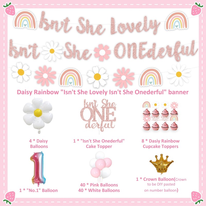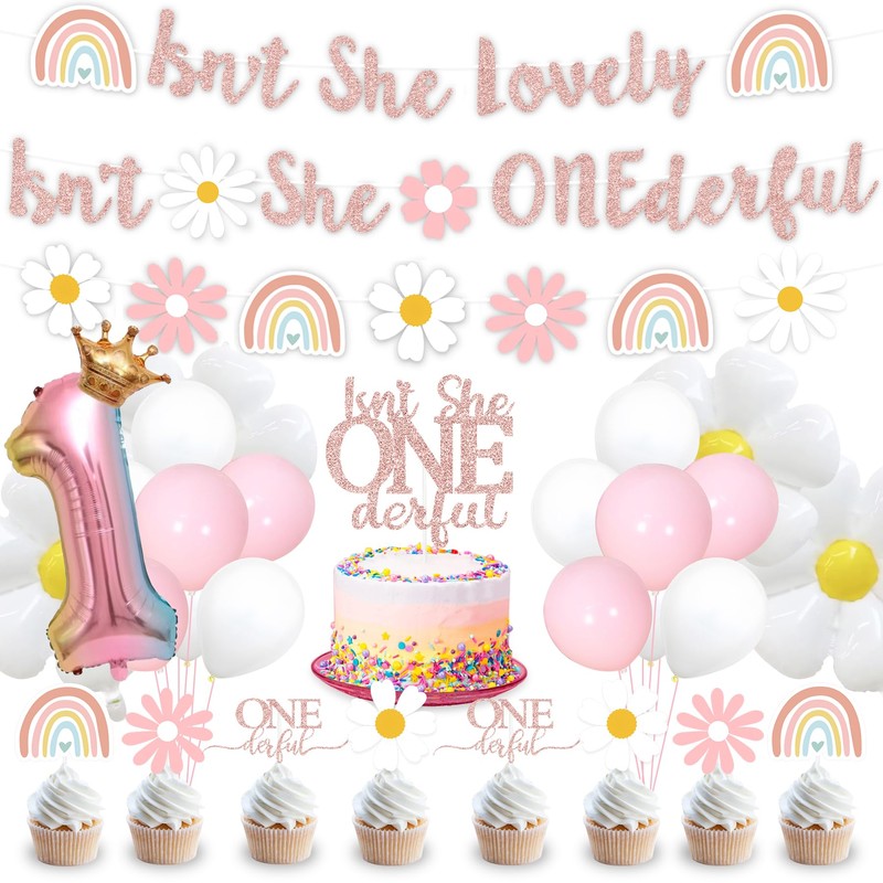 - COMPREHENSIVE BIRTHDAY PARTY KIT - With our Isn't She Onederful Birthday Decorations, you'll receive everything you need to create a magical girls first birthday party. The kit includes a "Isn't She Lovely Isn't She Onederful" banner, a daisy flower banner, an Onederful cake topper, daisy flower cupcake toppers, daisy flower balloon, number balloon with crown decor and balloons in pink and white hues. With this comprehensive set, your baby's 1st birthday party will be filled with theme fun and unforgettable moments for everyone to cherish.