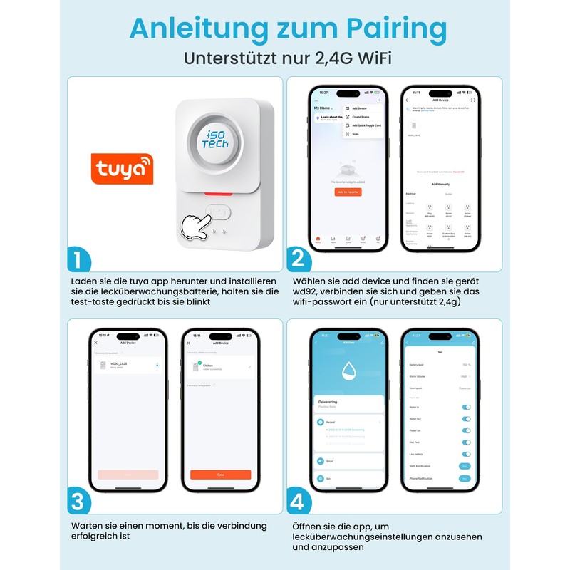 ISO TECH Wassermelder WLAN (Nur 2,4G) TUYA App mit Batterie, Smart Wassersensor WiFi 120dB Einstellbarer Alarm und App-Benachrichtigung, IP67 wasserdicht, Wasserwächter Boden für Küche, Bad, Keller