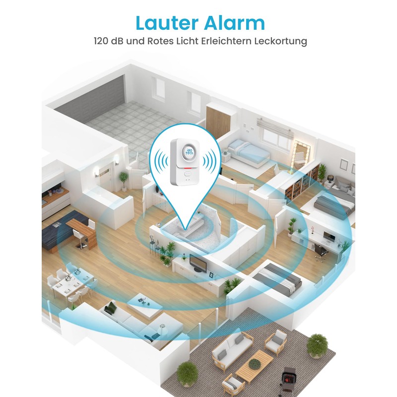 - 【Laute Alarmmeldung】Ein lauter Alarm mit bis zu 120 dB sowie ein rot blinkendes Licht helfen Ihnen, die Leckagequelle schnell zu finden und das Problem rechtzeitig zu beheben. Sie können die Lautstärke des Alarms über die App anpassen oder ihn stummschalten