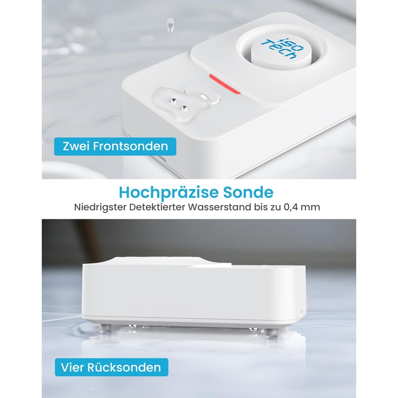 - 【Hochempfindlicher Alarm】Wassermelder smart ist mit vier hinteren und zwei vorderen Wassersensoren ausgestattet und erkennt Wasserstände ab nur 0,4 mm. Bei Tropfwasser, Leckagen oder Feuchtigkeit wird sofort Alarm ausgelöst. Kompaktes Design – ideal für Küche, Keller, Badezimmer, Waschküche usw