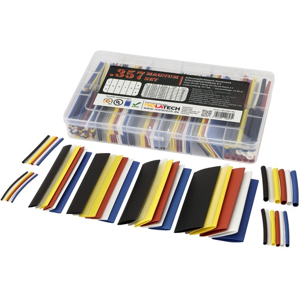 - Versatile set: the set includes 357 heat shrink tubing in different colours, pre-cut in 5 cm and 10 cm pieces with a total length of 21.45 metres. The following sizes are included: diameter 1 mm x 7 m, diameter 2 mm x 3.5 m, diameter 3 mm x 2.5 m, diameter 5 mm x 1.25 m, diameter 8 mm x 3 m, diameter 10 mm x 2.5 m, diameter 15 mm x 1.2 m. Diameter 20 mm x 0.5 m