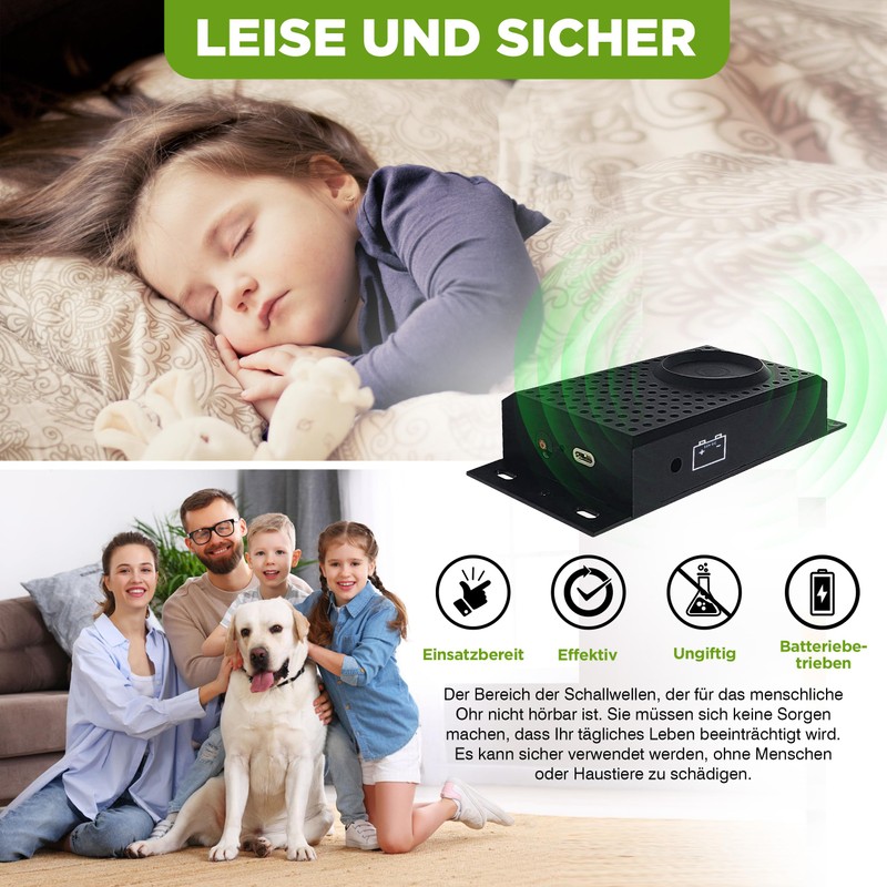 - NACHHALTIGER EFFEKT: Die Wechselfrequenz von 12-24 kHz verringert den Gew?hnungseffekt, sodass Tiere dauerhaft vertrieben werden k?nnen, ohne auf Fallen oder K?der zurckgreifen zu mssen.