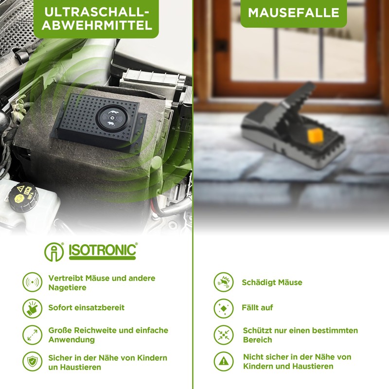 ISOTRONIC ISOTRONIC Marderschreck batteriebetrieben | Marderabwehr Blitzlicht + Ultraschall fr Haus, Auto, Garage, Garage, Dachboden | vertreibt Marder, M?use, Ratten | Innenraum und Fahrzeug, mardersicher