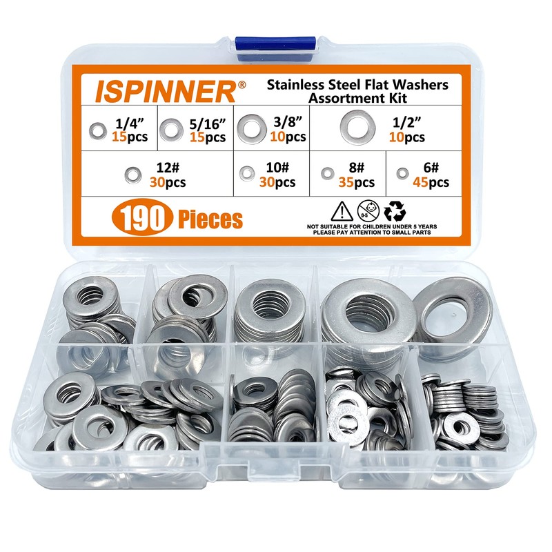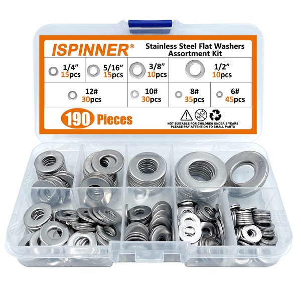 ISPINNER 190pcs 304 Stainless Steel Flat Washers Assortment Kit, 8 Sizes 1/2" 3/8" 5/16" 1/4" 12# 10# 8# 6#