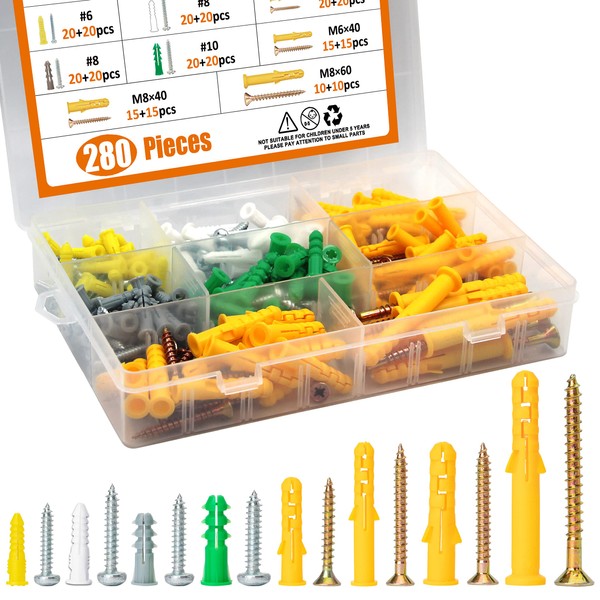 - ✔️【VARIOUS SIZE】This 280pcs wall anchors and screws assortment kit includes 8 sizes, 5 colors and 3 types anchors for you to deal with multiple different drywall. It includes #6 (40pcs yellow), #8 (40pcs white), #8 (40pcs grey), #10 (40pcs green), M6x30 (40pcs), M6x40 (30pcs), M8x40 (30pcs), M8x60 (20pcs).