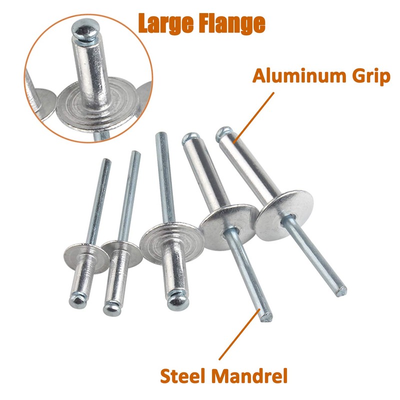 - STRONG HOLD - Large flange aluminum blind rivets can increase the connect area with the board to increase the force area. Thick shaft to ensure a secure hold and pop when tight.