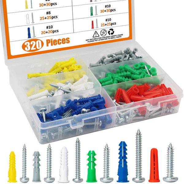 - [VARIOUS SIZE AND COLOR] ➤ This 320pcs wall anchors and screws assortment kit includes 6 different sizes and colors for you to deal with different drywall. It includes #6 (60pcs yellow), #8 (60pcs grey), #8 (50pcs white), #10 (60pcs green), #10 (40pcs blue), #10 (50pcs red).