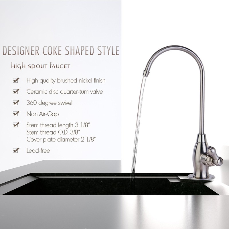 - Heavy duty non-air gap faucet with 360-degree free swivel and quarter turn handle; solid brass construction and durable ceramic disc provide trouble-free smooth operations. A safe channel for your freshly filtered water for you and your family.