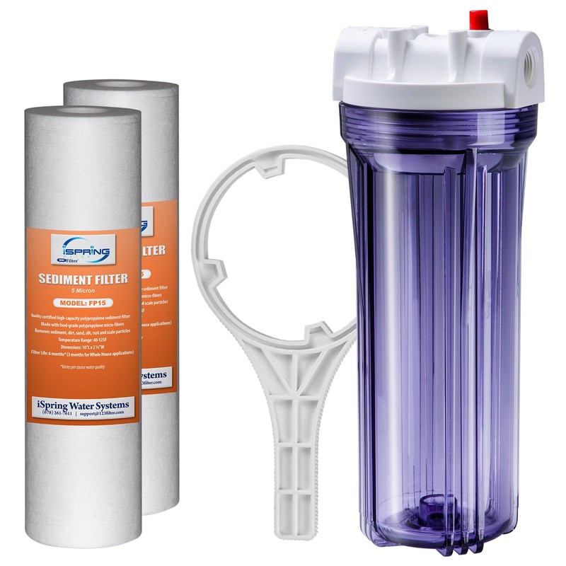 Transparent housing makes it easy to judge the filter status. Bonus: (2) 10" x 2.5" 5 micron sediment filters included