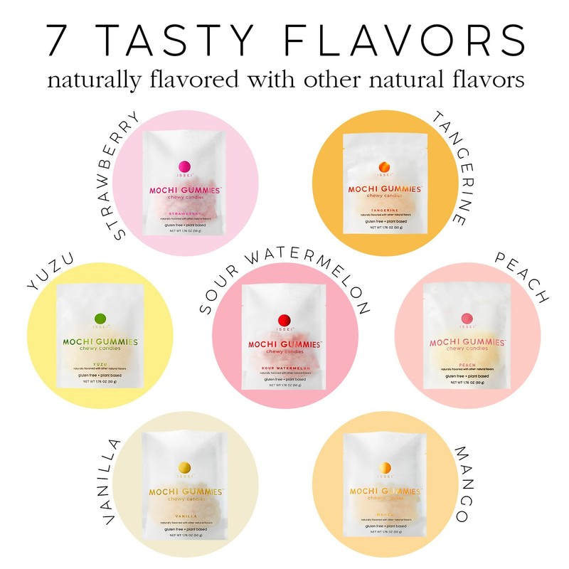 - Three delicious flavors: Enjoy the subtle vanilla, naturally sweet strawberry, and juicy mango flavors of our gluten-free and naturally flavored mochi gummies.