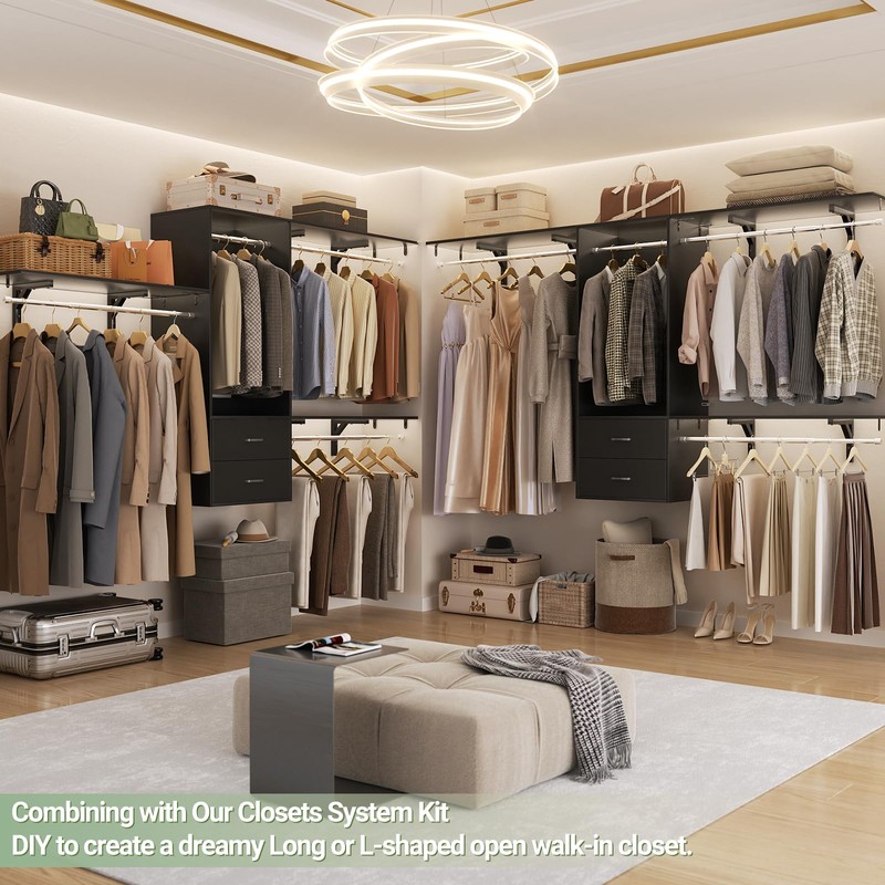 - 【Versatile Assembly Options – 4-8ft Closet System】Designed for walk-in closets spanning 4 to 8 feet in width, this heavy-duty clothing rack can be installed on one side or trimmed for smaller spaces. Use it individually or combine multiple units in bedrooms, dressing rooms, or laundry areas for flexible storage