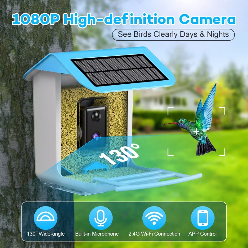 - Features: 1080P HD Camera and Night Vision, 2.4GHz Wi-Fi Connection and APP Control, 2.5L Container & IP65 Waterproof, Easy Clean, Easy Refill, Free AI Forever, Heavy Duty, Identify Bird Species, Long Lasting, Rain Proof, Squirrel Proof,, Weather Resistant, Wireless Connection, with Solar Panel