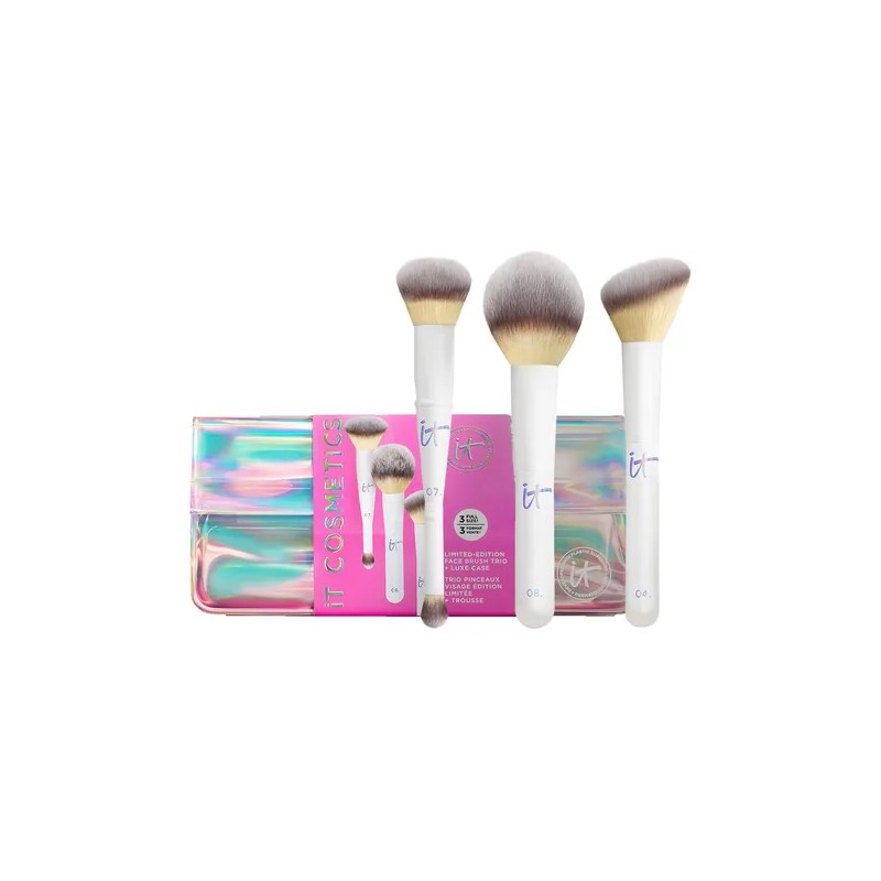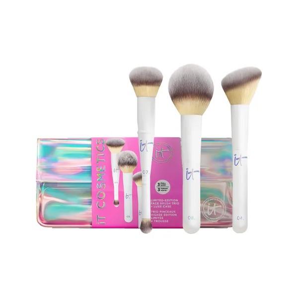 Este set incluye: Brocha Heavenly Luxe #7, Brocha Heavenly Luxe #8, Brocha Heavenly Luxe #4 y cosmetiquera Descubre el poder de crear con el Heavenly Luxe™ Brush, este set de IT Cosmetics, es un kit edición limitada diseñado para inspirar tu creatividad y realzar tu confianza cada día. Este set incluye tres brochas tamaño completo de nuestra galardonada colección Heavenly Luxe™, ahora reinventadas en un elegante acabado blanco mate, perfecto para la temporada. Creadas con fibras sintéticas ultrasuaves y de corte de precisión, las brochas Heavenly Luxe™ son reconocidas por ofrecer un acabado impecable, difuminado y sin esfuerzo. Su textura aterciopelada acaricia la piel mientras distribuye el producto de forma uniforme, logrando un maquillaje de aspecto profesional, sin líneas ni exceso de producto. Incluye una brocha 2 en 1 para base y corrector, ideal para lograr una cobertura natural y uniforme; una brocha para polvos sueltos o compactos, que fija y perfecciona tu maquillaje con suavidad; y una brocha para rubor o bronceador, que aporta color y dimensión con un acabado luminoso. Todo viene acompañado de una bolsa holográfica de lujo, perfecta para guardar y transportar tus esenciales de belleza con estilo. Inspirado en el espíritu festivo, este set no solo embellece, también celebra el poder de sentirte bien en tu propia piel. Ideal para ti o para regalar, el Heavenly Luxe™ Brush Set es más que un accesorio de maquillaje: es una experiencia de autoexpresión, suavidad y confianza.