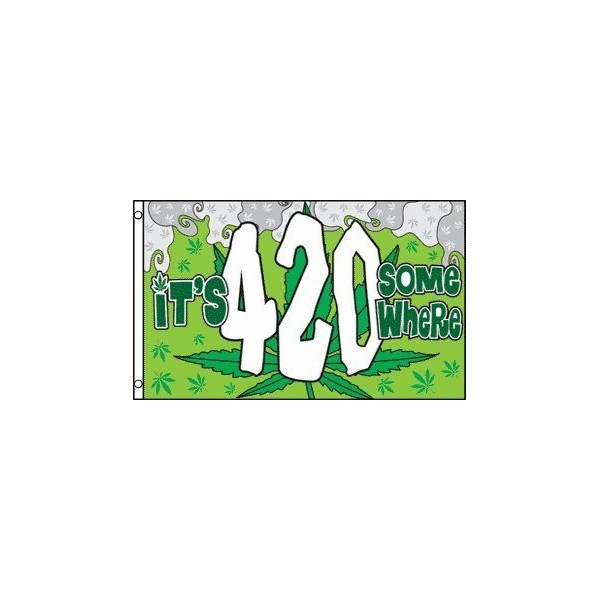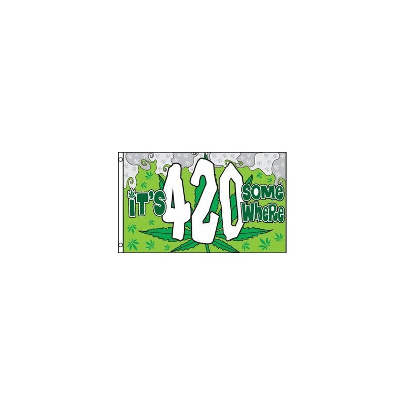 Our 3x5ft Polyester It's 4:20 Somewhere Flag has header tape and 2 metal grommets Flag is dye-sublimated with beautiful bold colors. Printed on one side all the way through the fabric. Double-stitched around all edges with 4 rows of stitching on fly edge.