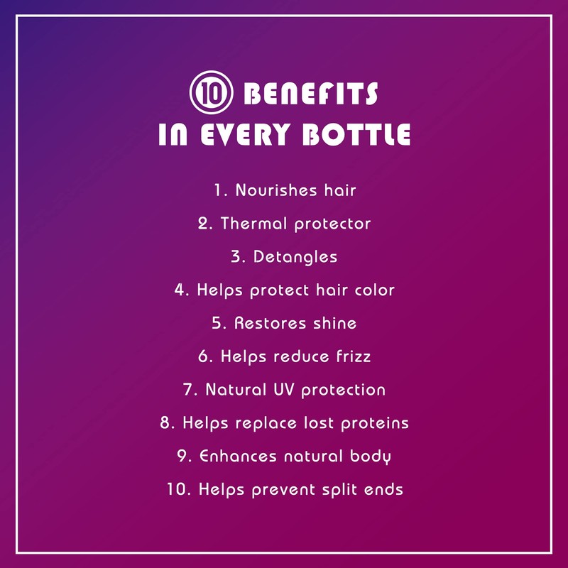 1\. Inhibits dry, damaged hair 2. Adds shine 3. Detangles 4. Controls frizz 5. Seals & protects hair color 6. Helps prevent split ends 7. Stops hair breakage 8. Creates silkiness 9. Enhances natural body 10. Flat iron spray & thermal protection STYLING TIP: Apply product to wet hair before blow drying or styling, or use on dry hair instead of styling cream for smooth, controlled hair.