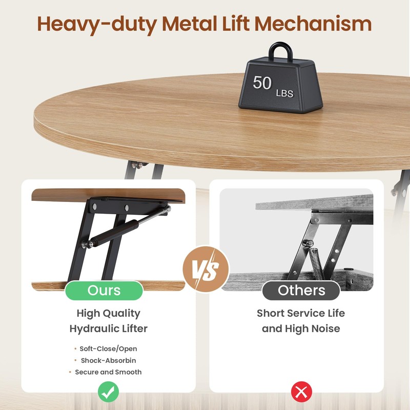 • 【Innovative Lifting Function】This coffee table with storage features a clever lift design that can enhance your living space. It uses a high-quality lift mechanism with a slow-rebound hydraulic support rod for smooth and safe lifting, no noise. The desktop height can be raised from 20.5 inches (about 52cm) to 25.8 inches (about 65.5cm), allowing you to easily work from home, enjoy delicious food, do crafts, or sit comfortably on the sofa to play games.