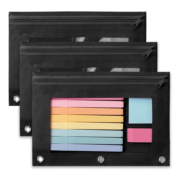 Itadaku 3 Pcs 3-Ring Pen Pencil Pouch with Clear Window, 3 Hole Binder Pencil Case, Canvas Binder Pouch with Zipper for Office, School & Home, Black