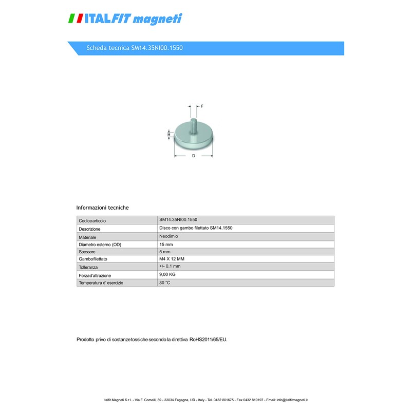 ▶ Neodymium magnet D.15 x 5 with M4 thread. We have developed the SM14 model so that it facilitates attachment through the stem and increases the adhesive force of the magnet itself, thanks to the glass that directs the magnetism to the free surface of the magnet.