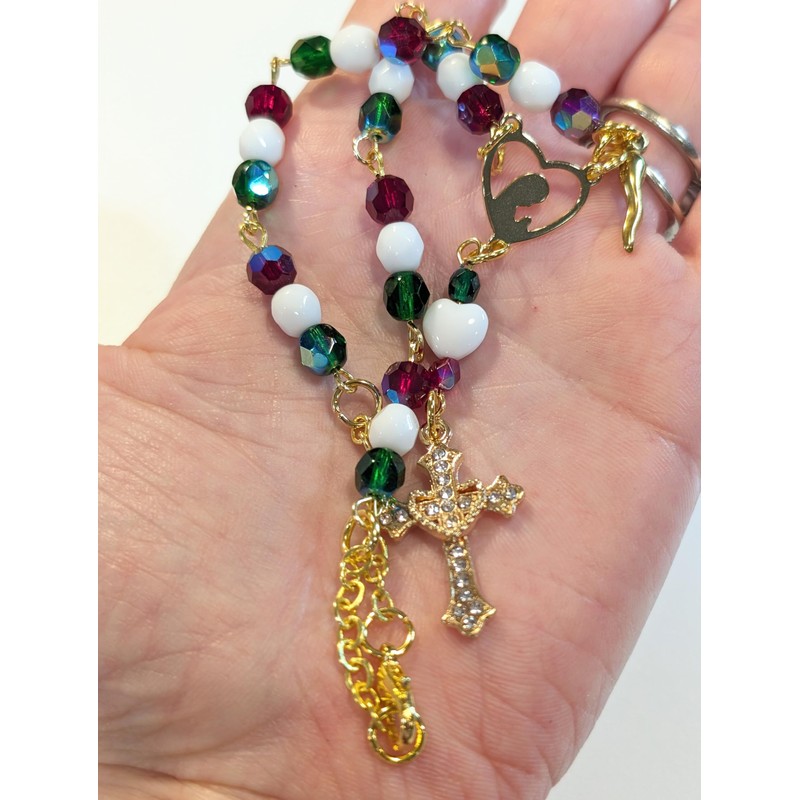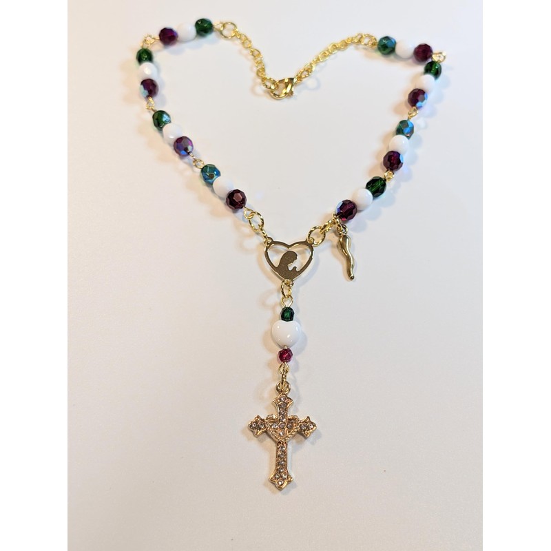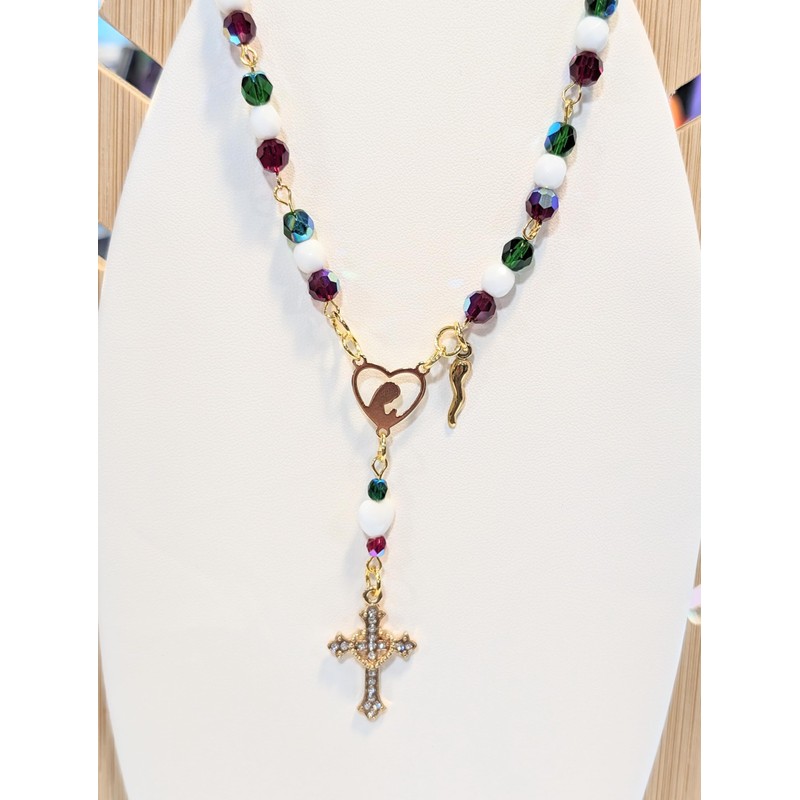 - 6mm Emerald AB, Siam AB, Chalk White Czech fire-polished Czech glass round beads, 10mm White Czech pressed heart, a gold double-sided Madonna connector, a rhinestone crucifix, lobster claw closure and a small gold Italian (Cornicello) charm