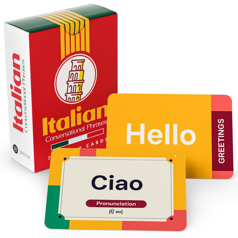 - Essential Italian Language Learning: Elevate your Italian language skills with 75 carefully selected flashcards that focus on essential conversational phrases. These cards cover critical categories such as Greetings, Introductions, Daily Life, Hobbies, and Class providing a well-rounded foundation for everyday communication. Whether you're preparing for a trip, expanding your cultural understanding, or helping children and students learn a new language, these cards are your guide