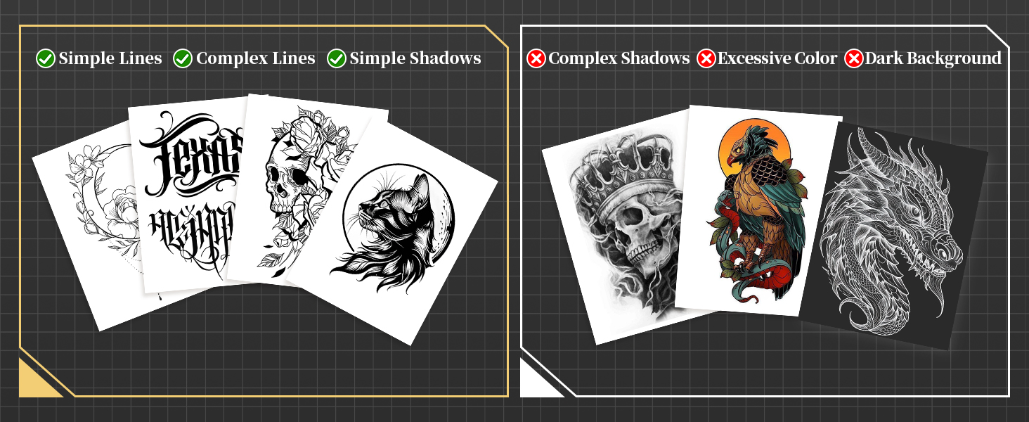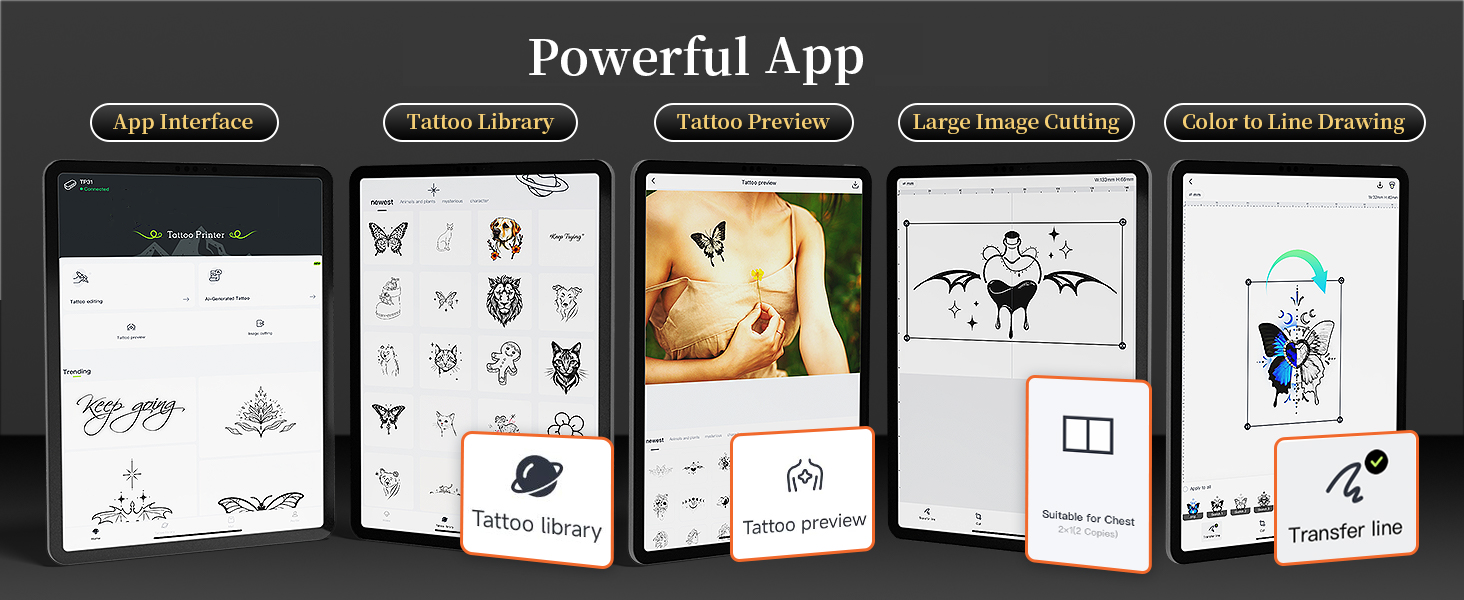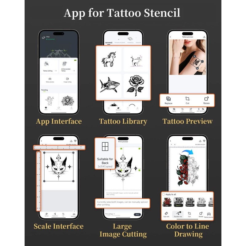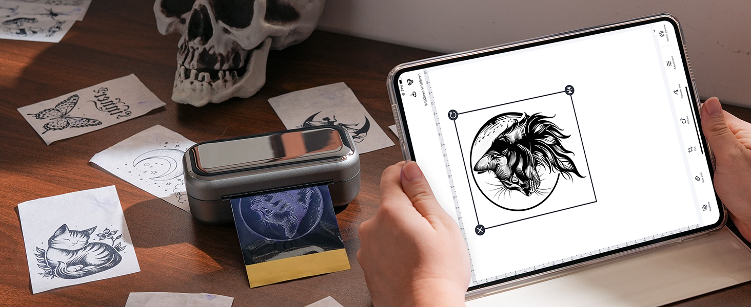 - Powerful Upgraded App: App allows for one-click printing, easy and efficient. It offers abundant tattoo stencils, you can also upload your favourite tattoo pattern and adjust the size and position for a tattoo preview! In addition, Phomemo App provide colour image to line drawing function and image cutting function for large tattoo stencils. You can efficiently create personalized tattoo designs
