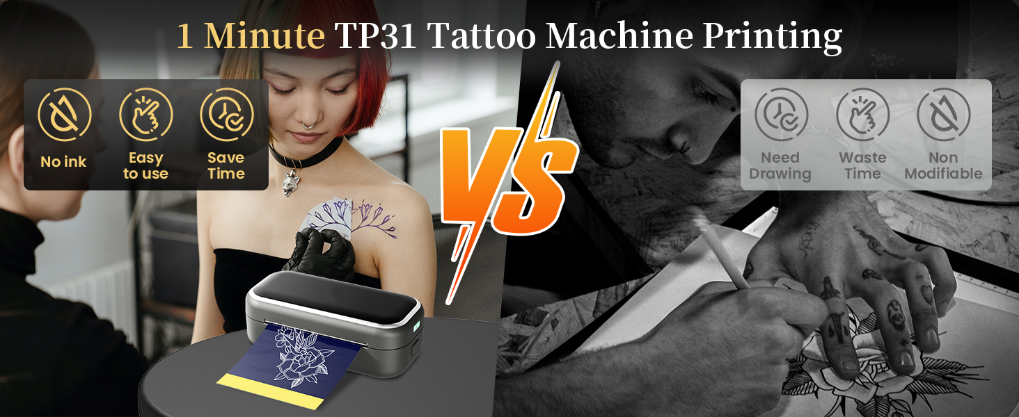 - TP31 Stencil Printer for Micro Tattoo: TP31 tattoo transfer printer is specifically designed for printing small tattoo templates, includes Micro Tattoos, Chicano Lettering, Old School Tattoos, New School Tattoos, saving time and cost. It works with 3.15x5.24 inches tattoo transfer paper. You can also cut US Letter or A4 size transfer papers to width of 3.15" (80mm) for use
