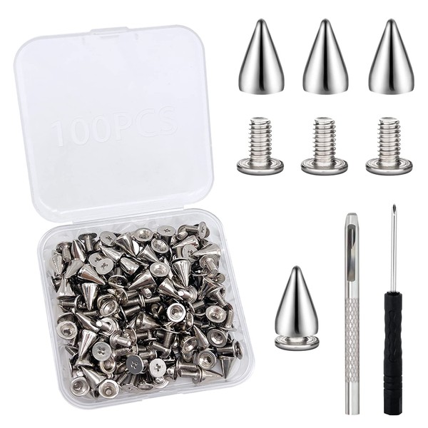 iTGOOS 100 Pieces Cone Spikes Studs Rivets Metal Bullet Cone Spikes with Screwbacks Metal Cone Spikes Screwback Studs Leather Spikes Rivets Clothing Decoration Silver