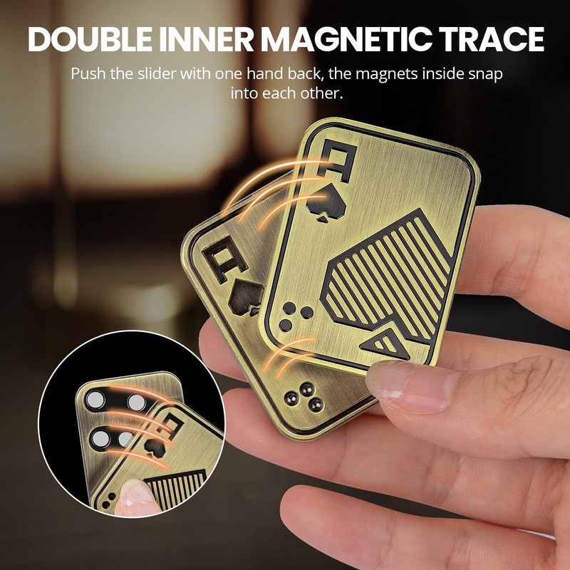 - Unique Fidget Toys:This gold fidget toys is made of high quality metal, both sides of the fidget slider are engraved with the ace of spade pattern in poker cards, double rows of magnetic track can be slid in sections. It can be pushed open and closed with one hand. In the process of fiddling with the pleasant sound, the metal block provides a comfortable feel and feedback of fidget blocks biting each other, giving you a sense of touch and hearing the double enjoyment of the fun can not stop.