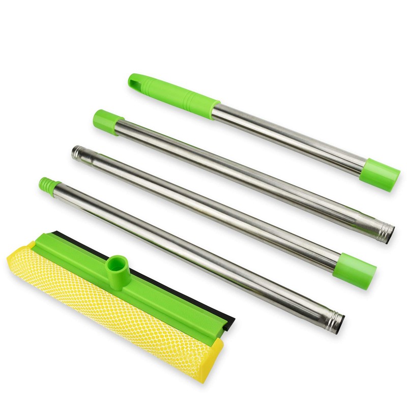 - Dimensions and Packing: The wide of the squeegee window cleaner is 10 inches and the length of the pole can reach up to 58 inches (4 section of poles), you can clean high windows. Package include 1 super absorbent sponge scrubber with mesh and natural rubber blade, four section of extension poles.Essential cleaning tool for every family and RV enthusiasts.