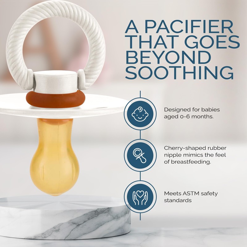 - NEWBORN PACIFIERS 0-6 MONTHS: Immerse your little one in comfort with our Natural Rubber Pacifiers. Specifically designed for babies aged 0-6 months, these feature a cherry-shaped nipple that closely mimics breastfeeding for a soothing experience.