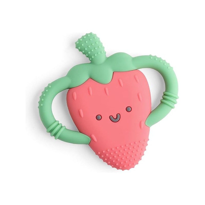 Itzy Ritzy Strawberry-Shaped Baby Teether with Handles; Silicone Teether for Babies with Easy-Grab Handles and Textured, Teethable Surfaces - Baby Teething Toy for 3 Months & Up (Strawberry)