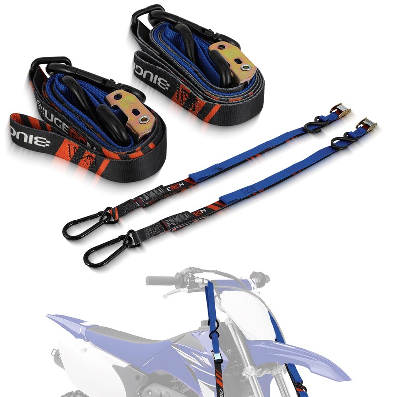 - 【Heavy-Duty】 These dirt bike tie down straps are crafted from ultra-strong material for superior corrosion resistance and durability. The wide webbing and reinforced stitching ensure a 2103 lbs break strength, ideal for securing ATVs, motocross bikes, and other mid-weight vehicles. Built to last through rugged hauls!