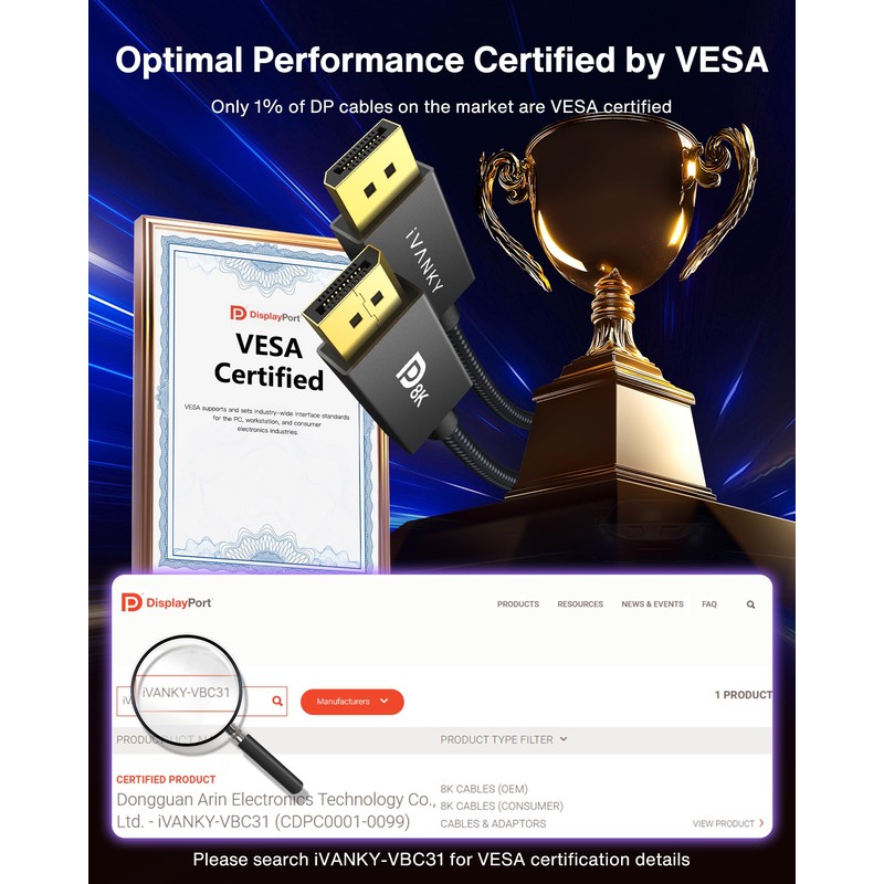 - [VESA Certified DP to DP Cable 1.4] This 8K DisplayPort Cable 1.4(NOT HDMI) is officially certified by VESA Association; iVANKY 8K DP Cable supports high resolutions 8K(7680x4320)@60Hz, 5K@60Hz, 4K@144Hz, 2K@240Hz, 1080P@240Hz and Dynamic HDR and HDCP 2.2; Backwards compatible with DisplayPort 1.3/1.2/1.1, etc; It also works fully with FreeSync and G-Sync; NOT compatible with HDMI / Mini DP