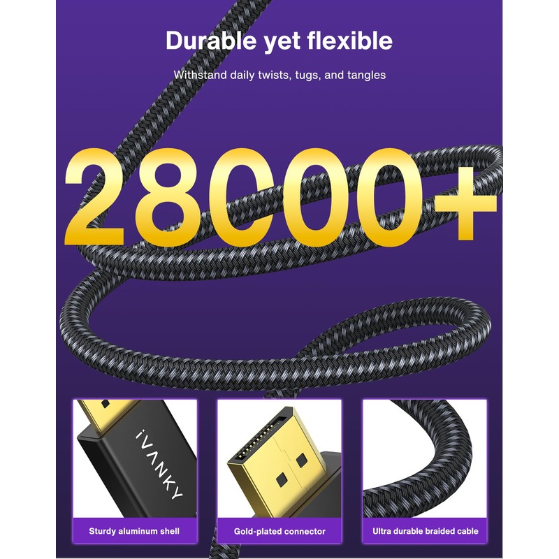 - [iVANKY's Customer Support] You'll receive 1 pack 8K DP Cable 6ft, along with our friendly support team ready to help within 24 hours; Each iVANKY cable undergoes meticulous testing to ensure it meets the highest quality standards; We also provide expert technical support to all our customers; Additionally, you can enjoy conditional customer support for up to 54 months
