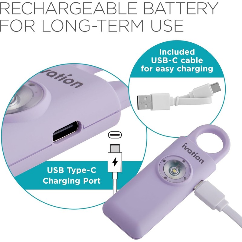 Run free and never fear with the Personal SOS Alarm Keychain with Rechargeable Battery from Ivation! This tiny device looks cute from afar, but come a little closer, and discover its powerful defense in the face of assailants, kidnappers, muggers, carjackers, and more. Earsplitting 130 dB sound and blinding strobe flash give you double the protection whenever you feel threatened or need to signal for emergency help. To get started, simply charge the device using the provided USB-C cable, clip the large keychain carabiner onto your purse, jacket zipper, or belt loop, and pull hard on the ring to activate immediately. Light and sound effects will run for up to 90 continuous minutes, people in the vicinity instantly take notice—and criminals take off! For more practical everyday purposes, this model also includes a built-in push-button flashlight to help you navigate confidently in the dark. Consider it your trusty personal bodyguard for early morning jogs, late-night walks, or any situation when you’re alone and vulnerable. And because it’s so small, lightweight, and simple to operate, there’s no excuse not to bring it along! Take your siren to work, school, shopping—even on the airplane, as it’s safe for travel. Peace of mind has never been so portable. Add an Ivation Personal SOS Alarm Keychain with Rechargeable Battery to your cart today!