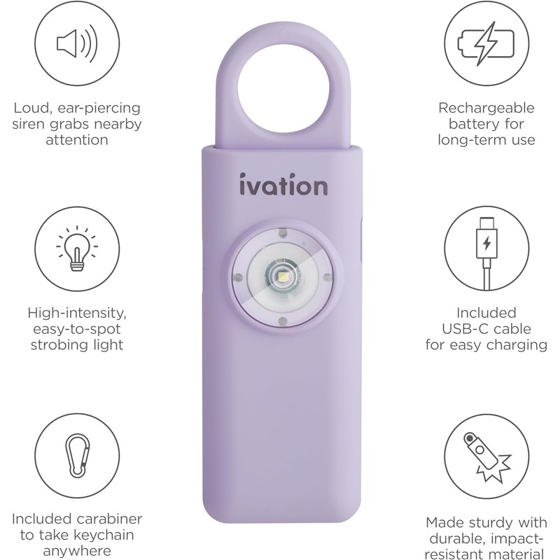 Ivation Personal Rechargeable SOS Alarm, Pocket Size Loud 130dB Sound Safety Siren & LED Panic Strobe Light with Carabiner Keychain Clip for Women, Children & Seniors, Lavender