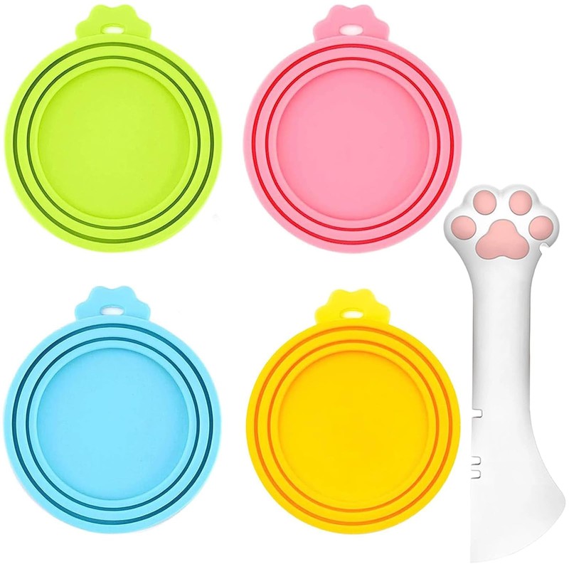 - UNIVERSAL SIZE: 4 x Cat Dog Food Can Lids Silicone covers (Pink/Green/Blue/Orange) & 1 x Pet spoon Can Opener (Pink). The lids have 3 different ring sizes with some stretch to fit most standard size pet cans. The can opener is also universal and can easily open a variety of cans.